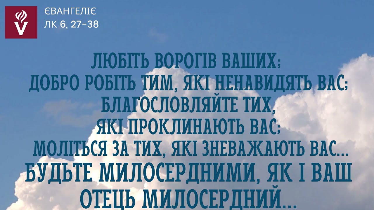 Того часу Ісус сказав до своїм учням:«Вам, хто слухає, кажу: Любіть ворогів ваших; добро робіть тим, які ненавидять вас; благословляйте тих, які проклинають вас; моліться за тих, які зневажають вас. Тому, хто б’є тебе по щоці, підстав і другу, а від того, хто забирає в тебе одяг, не борони й хітона. Кожному, хто просить у тебе, — дай, а від того, хто забирає твоє, — не домагайся. І як хочете, щоби чинили вам люди, — чиніть і ви їм так само. А якщо любите тих, хто любить вас, то яка вам благодать? Адже й грішники люблять тих, які їх люблять. І якщо добро чините тим, хто вам робить добро, яка вам благодать? Адже й грішники те саме чинять. І якщо позичаєте тим, від яких сподіваєтесь одержати, яка вам благодать? Грішники також позичають грішникам, щоб одержати стільки ж. Тож любіть ворогів своїх, робіть добро, позичайте,нічого не сподіваючись, — і буде вам велика нагорода та будете синами Всевишнього, тому що Він є добрий і до невдячних, і до злих. Будьте милосердними, як і ваш Отець милосердний. Також не судіть — і не будете суджені; не осуджуйте — і не будете осудженими. Прощайте — і проститься вам; давайте — і дасться вам; міру добру, натоптану, струснуту й переповнену дадуть вам у поділ. Бо якою мірою ви міряєте, такою ж відміряється вам». Слово Господнє