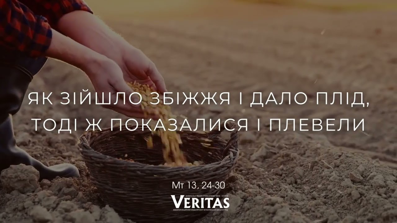 Того часу іншу притчу подав людям Ісус, кажучи: «Подібне Царство Небесне до людини, яка посіяла добре насіння на своєму полі. Коли люди спали, прийшов його ворог, посіяв плeвели серед пшениці та й пішов собі. А як зійшло збіжжя і дало плід, тоді ж показалися і плeвели. Тож підійшли слуги господаря і сказали йому: “Пане, хіба не добре насіння ти посіяв на своєму полі? Звідки ж узялися плeвели?” А він сказав їм: “Людина-ворог це зробила”. І кажуть йому слуги: “Хочеш, щоб ми пішли й зібрали їх?” Він же сказав: “Ні, щоб ви часом, збираючи плeвели, не повиривали разом з ними і пшениці. Дозвольте, щоб і те, й друге разом росло до жнив, а в час жнив скажу женцям: зберіть спершу плeвели та пов’яжіть їх в снопи, аби спалити їх, а пшеницю зберіть до мого сховища”». Слово Господнє.